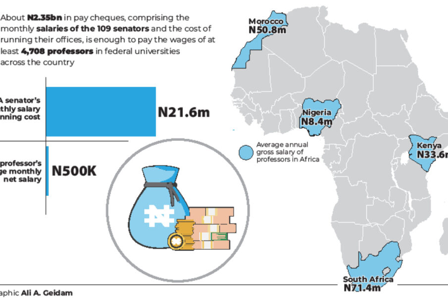 About N2.354 billion in pay cheques, comprising the monthly salaries of the 109 senators and the cost of running their offices, is enough to pay monthly wages of 4,708 professors at universities across the country.