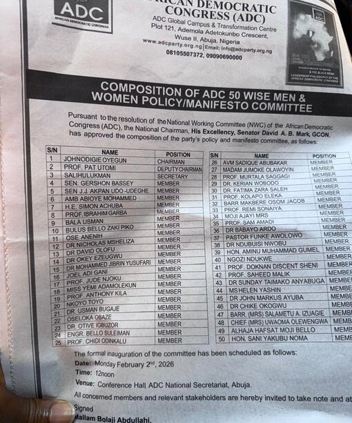 The ADC on Wednesday released the named following approval by its National Working Committee and the party’s National Chairman, Senator David Mark.