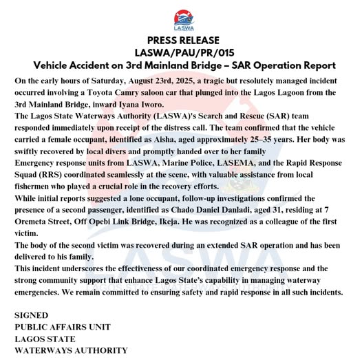 The Lagos State Waterways Authority (LASWA) has confirmed the recovery of the body of a second victim after a Toyota Camry saloon car somersaulted and plunged into the Lagos Lagoon from the Third Mainland Bridge.
