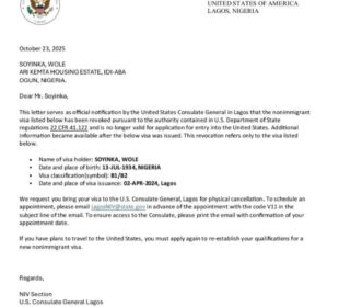 The letter by the United States of America informing the Nobel Laureate Professor Wole Soyinka, of the cancellation of the visa has ...2025-10-29