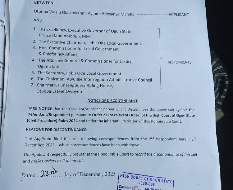The lead lawyer to KWAM I, Dr Wahab Shittu (SAN), filed the Notice of Discontinuance dated December 22, 2025 while the application was acknowledged by the court on the same date.
