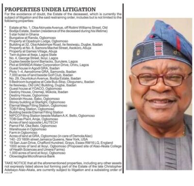 A legal battle has revealed a sprawling portfolio of properties owned by late governor of Oyo State, Adebayo Alao-Akala ...Tracy Ohiri: Umahi initiates lawsuit, offers N1bn for proof of indebtedness
