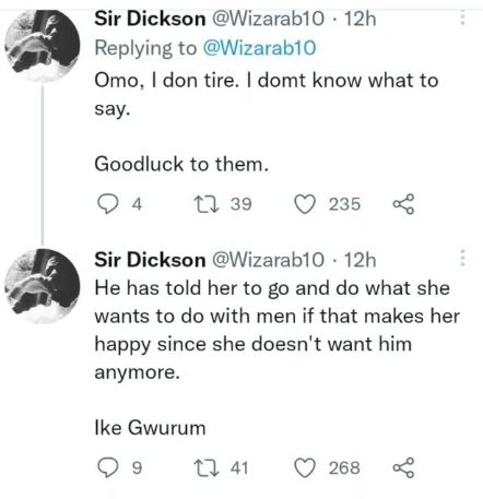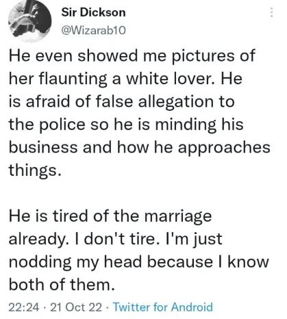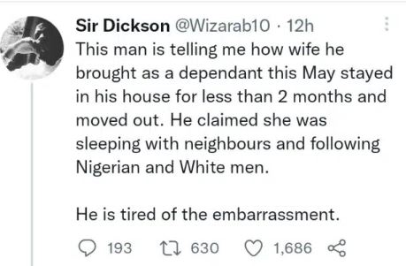 Sir Dickson wrote: “This man is telling me how wife he brought as a dependent this May stayed in his house for less than 2 months and moved out. He claimed she was sleeping with neighbours and following Nigerian and White men.