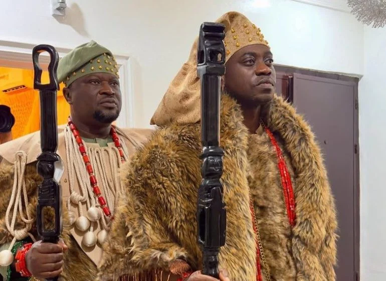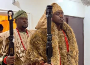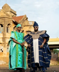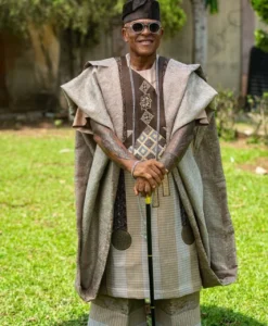 His brown agbada and sokoto were styled with silver jewellery and a bold lion-head sceptre.