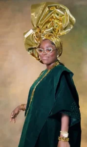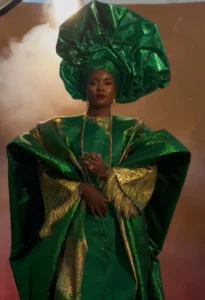Media personality Tomike Adeoye wore an emerald green velvet outfit, elegantly styled with shimmering gold accessories.