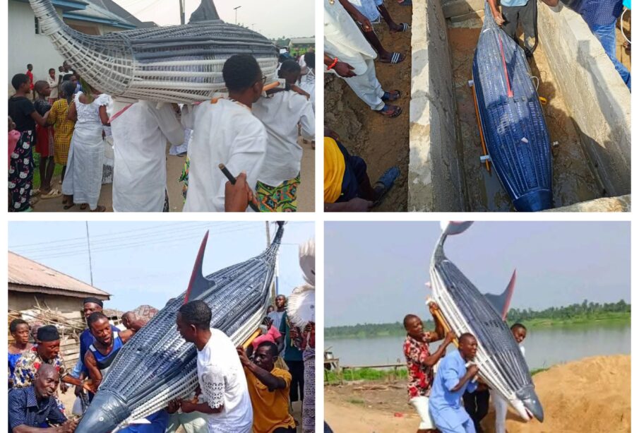 A 120-year-old woman was buried in a customised dolphin-shaped casket in Oboro community, in the Bomadi Local Government Area of Delta State.