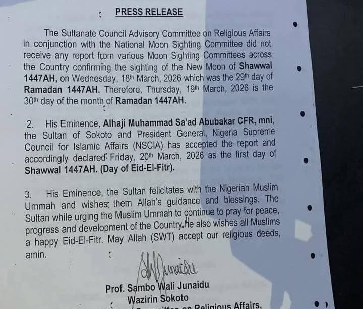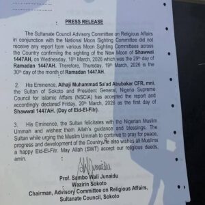 A statement by the Chairman of the Advisory Council, Professor Sambo Junaidu, Wazinrin Sokoto, said the Sultan of Sokoto, His Eminence Alhaji Muhammad Sa’ad Abubakar, who is also the President General of the Nigeria Supreme Council for Islamic Affairs has accepted the report and has according declared March 20, 2026, as a ye first day of Shawwal (Day of Eid-el-Fitr).