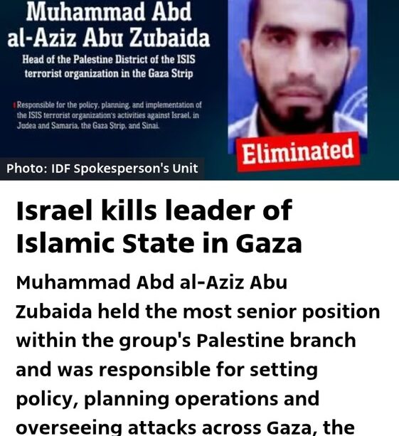 The IDF said Muhammad Abd al-Aziz Abu Zubaida, who headed the group’s Palestine branch, was struck in the Bureij area over the past week under the direction of the Southern Command and the military intelligence directorate.