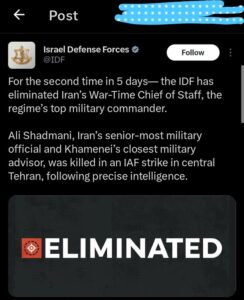 Israel kills Iran’s top commander In charge of Iranian Armed Force, Ali Shadmani