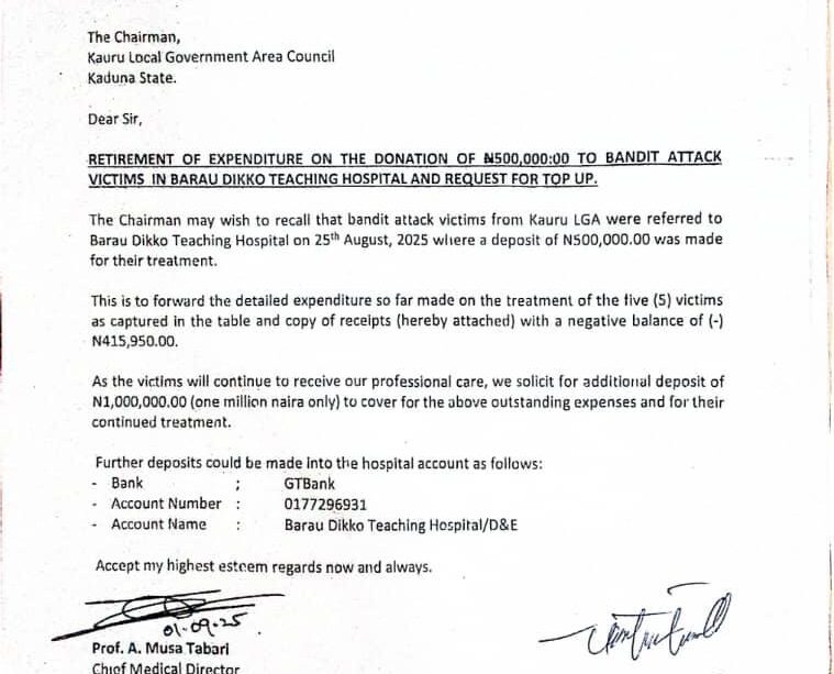 According to the letter, the hospital stopped dispensing drugs and issuing prescriptions after an initial N500,000 deposit from Kauru Local Government Chairman, Bashir Dawaki, was exhausted, leaving an outstanding bill approaching N1 million.