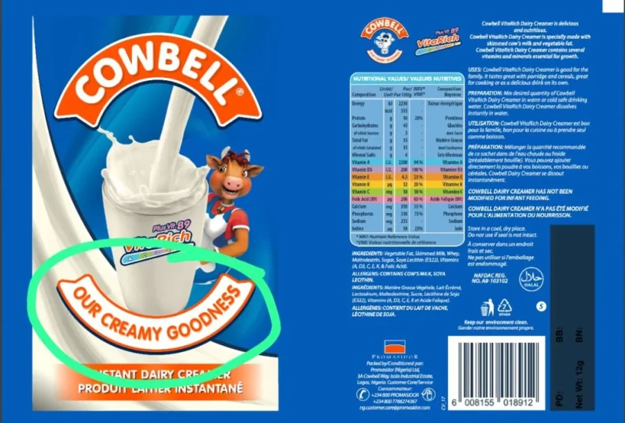 The National Agency for Food and Drug Administration and Control (NAFDAC) has warned Nigerians about counterfeit 12g Cowbell “Our Milk” currently in circulation.