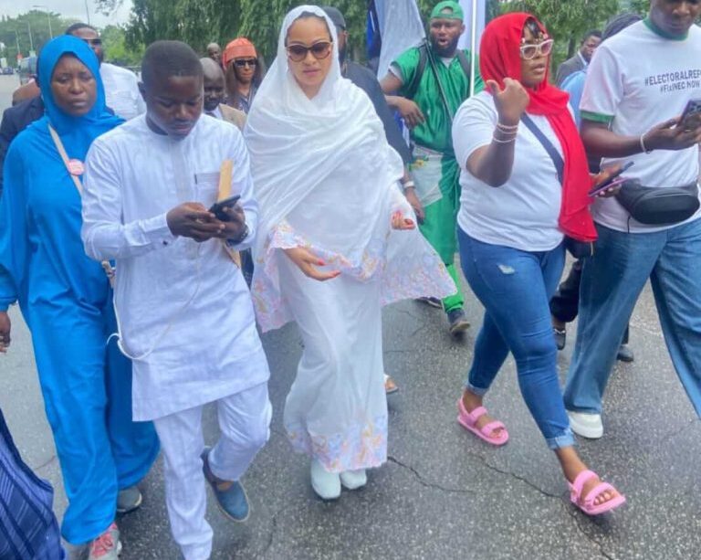 Suspended Kogi State senator Natasha Akpoti-Uduaghan on Tuesday attempted to trek into the upper chamber of the National Assembly after her convoy was stopped at the first gate of the complex.