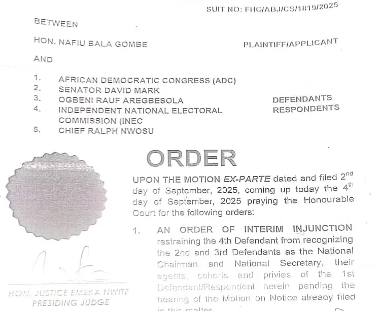The faction of the African Democratic Congress led by Nafiu Bala Gombe, has asked the newly recognised leadership of the party to obey the September 4 ruling of the Federal High Court which restrained former Senate President, David Mark, former Osun State Governor, Rauf Aregbesola, and others from parading themselves as national executive members of the party.