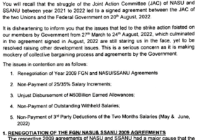 The protesting university workers are demanding, among other things, the renegotiation of the 2009 agreement with the federal government, immediate payment of 25 and 35 per cent salary increment, and the immediate payment of all withheld salaries