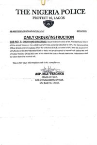 One of the VIP police units, the Police Special Protection Unit, in Lagos State on Monday in a statement directed its personnel to report back to the head office, adding that a meeting and headcount had been scheduled for today, Tuesday.