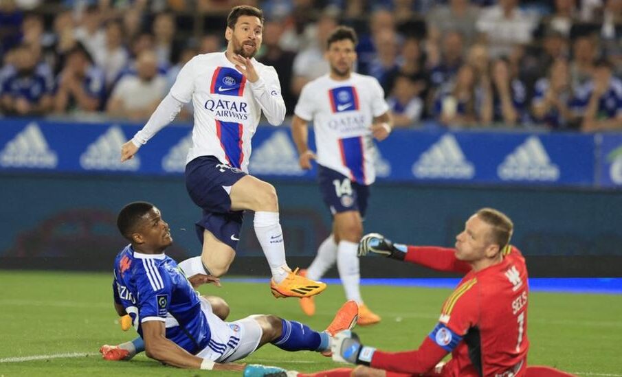 Lionel Messi scored another record-breaking goal as Paris St-Germain won an unprecedented 11th Ligue 1 title with a draw at Strasbourg.