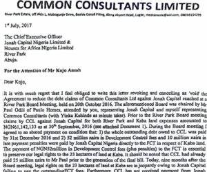 He wrote, “Dear Kojo, It is with much regret that I feel obliged to write this letter revoking and cancelling as ‘void the Agreement to reduce the debt claims of Common Consultants Ltd against Jonah Capital reached at a River Park Board Meeting, held on 20th October 2016. The aforementioned Board was chaired by Mr Paul Odili of Paulo Homes, attended by you, representing Jonah Capital and myself representing Common Consultants (with Yinka Kehinde as minute taker).