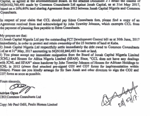 “Prior to the River Park Board meeting claims by CCL against Jonah Capital for both River Park and Kaba land expenses amounted to NGN61,142,133 as at 30th September, 2016. During the Board meeting, I agreed to an abated payment on condition that: 1) the whole outstanding debt owed to CCL was paid by 31st December 2016 and 2) 52 million naira in Development Control fees and 10 million naira in late payment penalties were paid by Jonah Capital Nigeria directly to the FCT in respect of Kaba land.