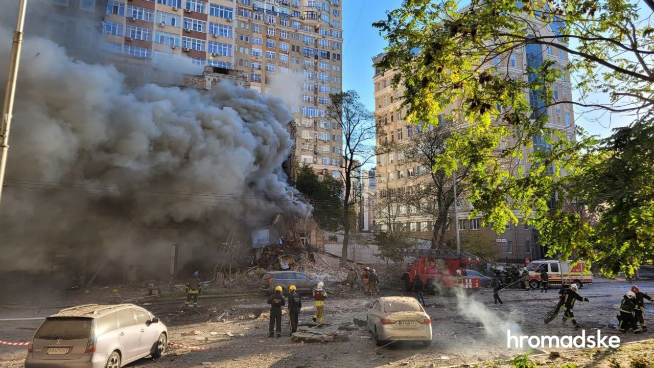 The blasts echoed across Kyiv, setting buildings ablaze and sending people rushing to shelters.