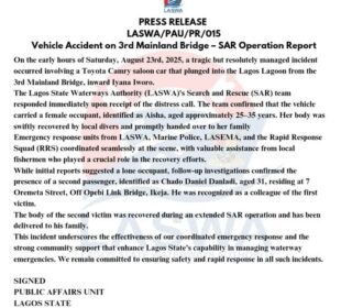The Lagos State Waterways Authority (LASWA) has confirmed the recovery of the body of a second victim after a Toyota Camry saloon ...