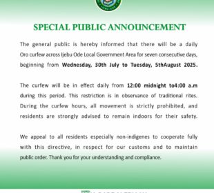 The Ijebu-Ode Local Government Area of Ogun State has announced a seven-day curfew for the observance of “Oro” rites. The Executive ...
