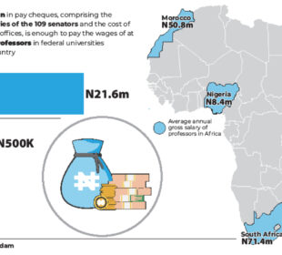 About N2.354 billion in pay cheques, comprising the monthly salaries of the 109 senators and the cost of running their offices, is ...