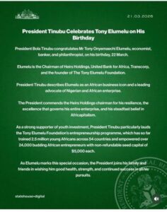 President Bola Tinubu has congratulated economist, banker and philanthropist, Tony Elumelu, on his 62nd birthday.