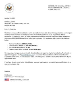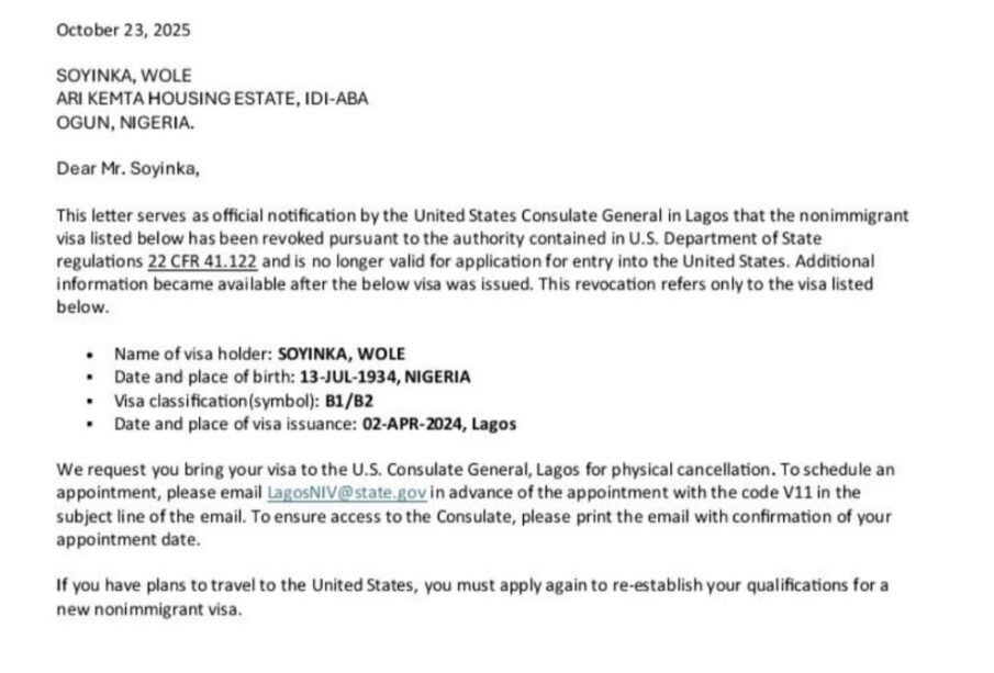 The letter by the United States of America informing the Nobel Laureate Professor Wole Soyinka, of the cancellation of the visa has surfaced online.