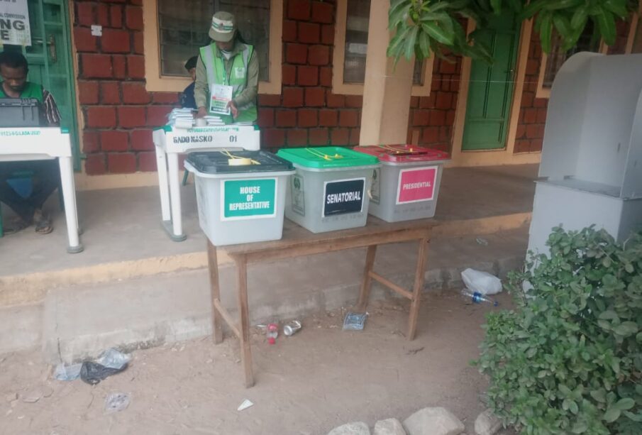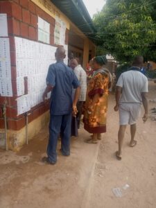 Voters at Ward 003, Gado-Nasko Primary School, Gwagwalada LGA, Abuja checking the INEC register to confirm their names and polling units as of 7:39 am.